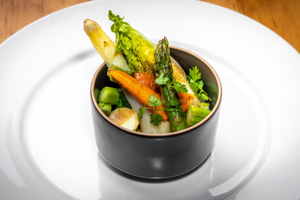 • Voorgerecht: Tarbotfilet langzaam gegaard in citroenolie & gemarineerde sardinefilets met een Ceviche van Coquille geserveerd met gegrilde little gem sla, zalf van bataat met tinten van grapefruit